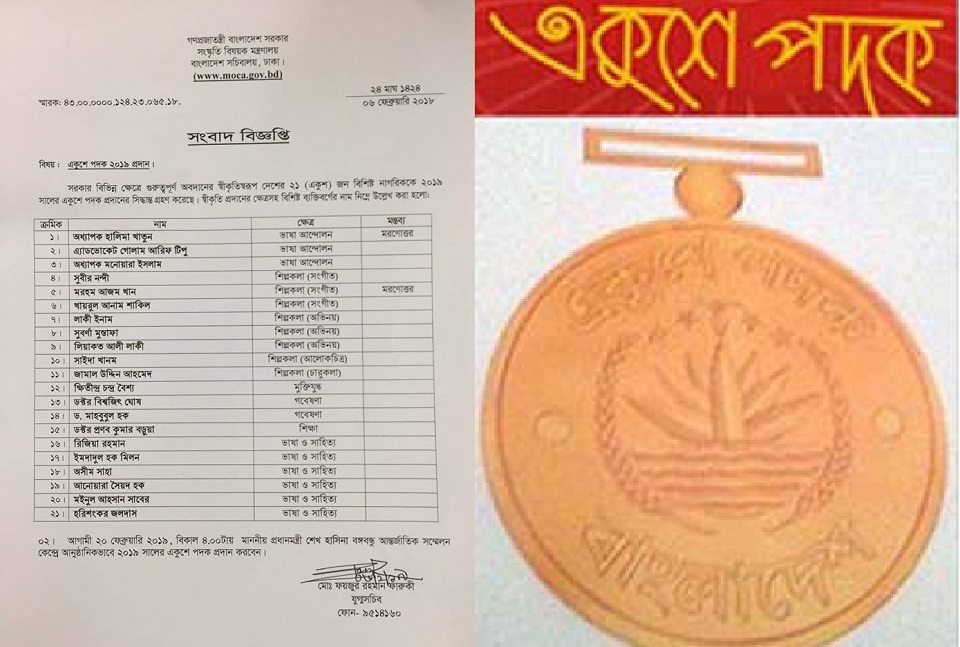 চলতি বছরের একুশে পদকপ্রাপ্তরা হলেন- ভাষা আন্দোলনে অধ্যাপক হালিমা খাতুন, অ্যাডভোকেট গোলাম আরিফ টিপু ও অধ্যাপক মনোয়ার ইসলাম। শিল্পকলায় (সঙ্গীত) সুবীর নন্দী, মরহুম আজম খান ও খায়রুল আনাম শাকিল। শিল্পকলা অভিনয়ে লাকী আনাম, সুবর্ণ মোস্তফা ও লিয়াকত আলী লাকী।