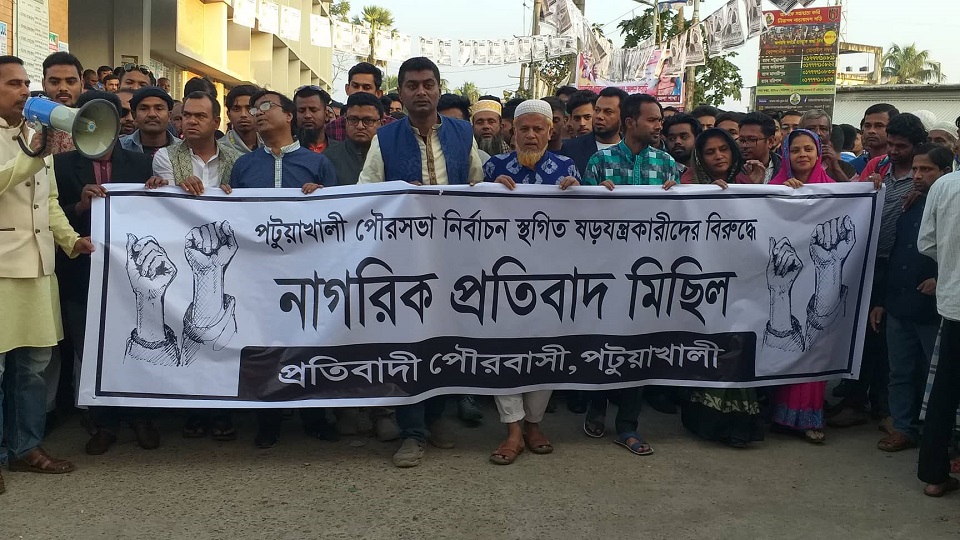 আগামী ২৮ফেব্রুয়ারি অনুষ্ঠিতব্য বহুল প্রতিক্ষিত পটুয়াখালী পৌরসভার নির্বাচন স্থগিতের প্রতিবাদে প্রতিবাদী পৌরবাসীর ব্যানারে নাগরিক প্রতিবাদ বিক্ষোভ মিছিল ও সমাবেশ অনুষ্ঠিত হয়েছে। গত ১১ফেব্রুয়ারি প্রতীক বরাদ্ধের পর বেশ জমজমাট হয়ে উঠেছিল নির্বাচন। এরকম অবস্থায় টাউন জৈনকাঠি এলাকার জনৈক আঃ রাজ্জাক আজ দুপুরে মহামান্য হাইকোর্টে সীমানা বিষয়ক একটি রিট দাখিল করে পৌরসভা নির্বাচন স্থগিতের আবেদন করেন। মহামান্য হাইকোর্টের বিজ্ঞ বিচারক আগামী ১ মাসের জন্য পটুয়াখালী পৌরসভা নির্বাচন স্থগিতের আদেশ দেন।