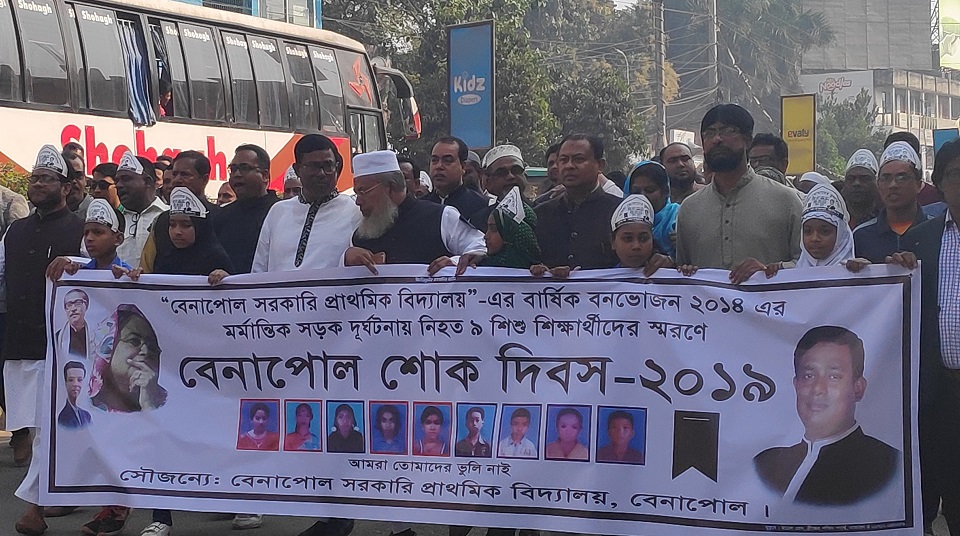 আজ ১৫ ফেব্রুয়ারি বেনাপোল ট্রাজেডির পাঁচ বছর। এই দিনে সড়ক দুর্ঘটনায় নিহত হয় বেনাপোল সরকারী প্রাথমিক বিদ্যালয়ের ৯ শিশু এবং আহত হয় ৪৭ জন শিশু শিক্ষার্থী। ২০১৪ সালের ১৫ ফেব্রুয়ারি শিক্ষা সফরে মুজিব নগরে বার্ষিক বনভোজন শেষে চৌগাছা হয়ে বেনাপোল ফেরার পথে ঝাউতলা কাঁদবিলা পুকুর পাড়ে এক মর্মান্তিক সড়ক দুর্ঘটনায় নিহত হয় এসব শিশু শিক্ষার্থীরা। নিহতদের স্বরণে বেনাপোলে নির্মাণ করা হয়েছে স্মৃতিস্তম্ভ ।