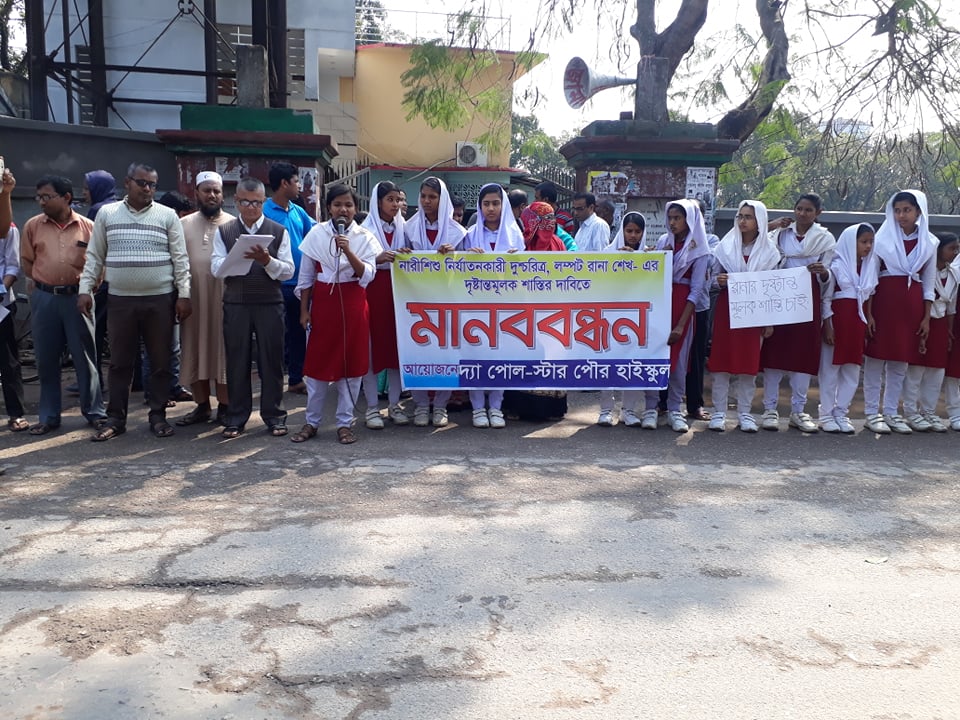 সাতক্ষীরায় চতুর্থ শ্রেণির স্কুলছাত্রীকে যৌন নিপীড়নকারী রানা শেখের দৃষ্টান্তমূলক শাস্তির দাবিতে সাতক্ষীরায় মানববন্ধন কর্মসূচি পালিত হয়েছে।