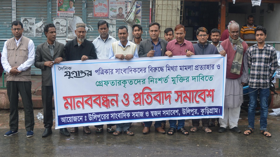 দৈনিক যুগান্তর পত্রিকার গ্রেফতারকৃত দুই সাংবাদিকের মুক্তি ও চার সাংবাদিকের বিরুদ্ধে মিথ্যা মামলা প্রত্যাহারের দাবিতে আজ বুধবার দুপুরে কুড়িগ্রামের উলিপুরে উপশহরের চাররাস্তা মোড়ে মানববন্ধন ও প্রতিবাদ সমাবেশ অনুষ্ঠিত হয়েছে।