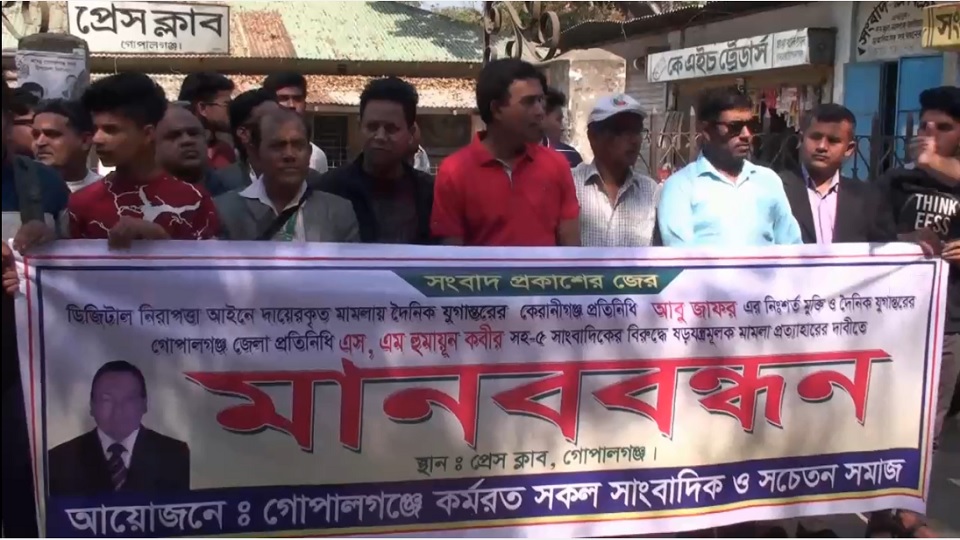 ডিজিটাল নিরাপত্তা আইনে দায়েরকৃত মামলায় দৈনিক যুগান্তরের কেরানীগঞ্জ প্রতিনিধি আবু জাফরের নিঃশর্ত মুক্তি ও গোপালগঞ্জ প্রতিনিধি এস.এম হুমায়ুন কবীরসহ ৫ সাংবাদিকের বিরুদ্ধে ষড়যন্ত্রমূলক মামলা প্রত্যাহারের দাবীতে মানববন্ধন ও প্রতিবাদ সমাবেশ অনুষ্ঠিত হয়েছে। গোপালগঞ্জের কর্মরত সকল সাংবাদিক ও সচেতন সমাজের ব্যানারে এসব কর্মসূচি পালিত হয়।