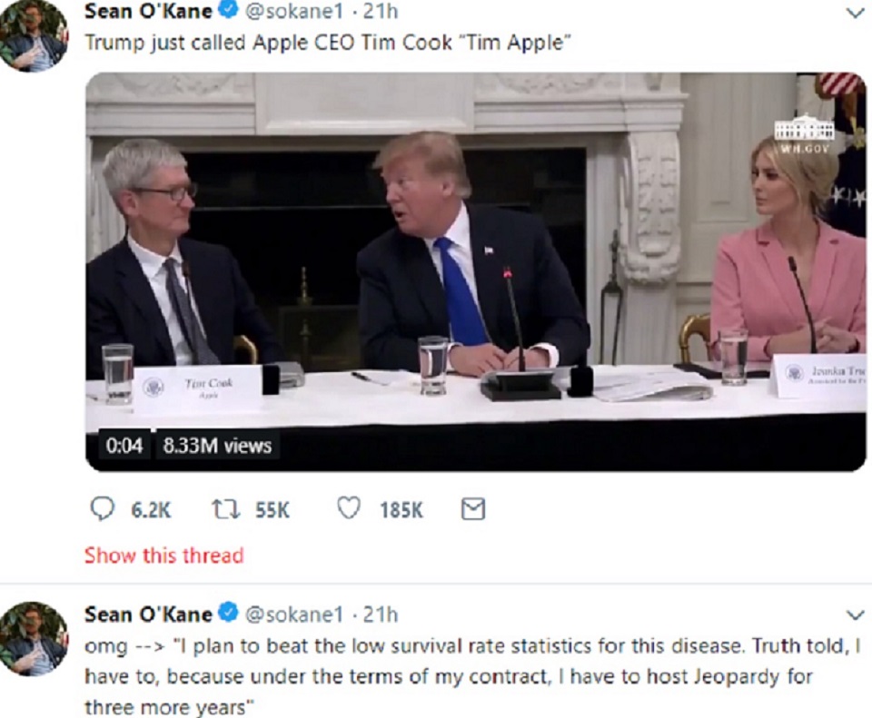 অ্যাপল কর্তাকে ভুল নামে ডেকে ফের হাসির খোরাক হয়েছেন ডোনাল্ড ট্রাম্প। যা সোশ্যাল মিডিয়ায় ভাইরাল হয়ে রীতিমত উত্তাল সৃষ্টি করেছে। কর্মক্ষেত্রের সুযোগ সুবিধা, নীতি-নিয়ম নির্ধারণ নিয়ে হোয়াইট হাউসে বুধবার আমেরিকান ওয়ার্কফোর্স পলিসি অ্যাডভাইসরি বোর্ডের বিশেষ বৈঠকেই এ ঘটনা ঘটে।