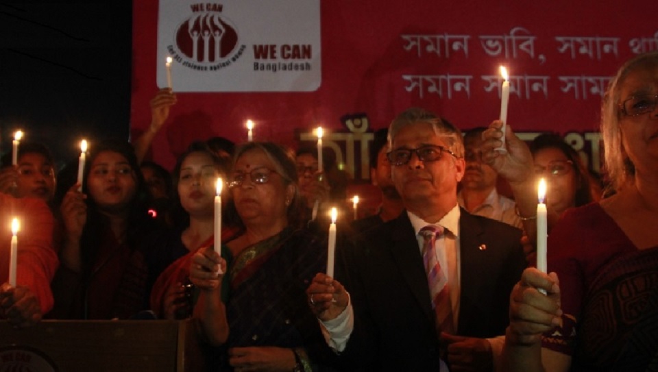 রাত ১২টা এক মিনিটে নারী নির্যাতন দূর করতে মোমবাতি প্রজ্জ্বলন করা হয়। এসময় নারীদের অধিকার বিষয়ে সচেতন করতে শপথ নেন সবাই।