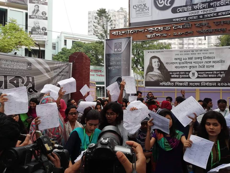 এর আগে সকাল ৮টায় এই ভোটগ্রহণ শুরুর কথা থাকলেও বাংলাদেশ কুয়েত মৈত্রী হলে সঠিক সময় ভোট শুরু হয়নি। শিক্ষার্থীরা দাবি করে খালি ব্যালট বাক্স দেখানো না হলে ভোট শুরু হবে না। পরে হলের ভিতর থেকে ছাত্রলীগ প্যানেলের প্রার্থীদের পক্ষে সিল মারা এক বস্তা ব্যালট পেপার উদ্ধার হয়। এবং কুয়েত মৈত্রী হলের ভোটগ্রহণ স্থগিত করা হয়।