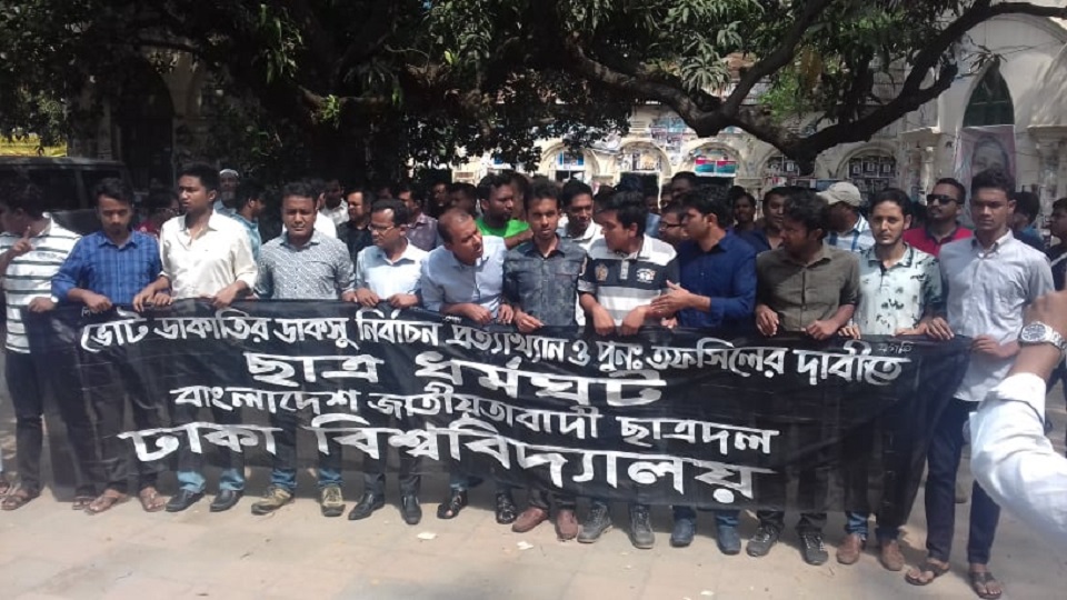 ঢাকা বিশ্ববিদ্যালয়ের কেন্দ্রীয় ছাত্র সংসদ (ডাকসু) নির্বাচন প্রত্যাখ্যান ও পুনঃতফসিলের দাবিতে ছাত্র ধর্মঘট পালন করছে ছাত্রদল। আজ সকালে মধুর ক্যান্টিন থেকে মিছিল নিয়ে অপরাজেয় বাংলার সামনে অবস্থান করে সমাবেশ করছে ছাত্রদলের নেতা কর্মীরা।