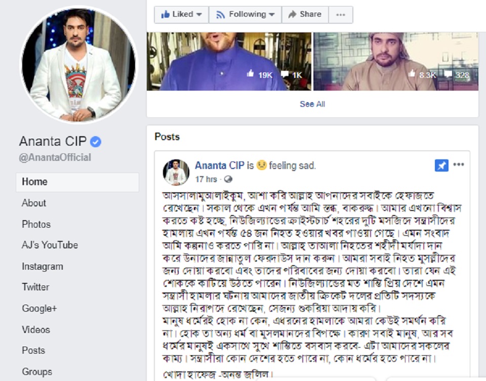 শুক্রবার রাতে ফেসবুক স্ট্যাটসে অনন্ত জলিল লিখেন, ‘সকাল থেকে এখন পর্যন্ত আমি স্তব্ধ, বাকরুদ্ধ। আমার এখনো বিশ্বাস করতে কষ্ট হচ্ছে, নিউজিল্যান্ডের ক্রাইস্টচার্চ শহরের দুটি মসজিদে সন্ত্রাসীদের হামলায় এখন পর্যন্ত ৫৪ জন (প্রকৃত পক্ষে মারা গেছেন ৪৯জন) নিহত হওয়ার খবর পাওয়া গেছে। এমন সংবাদ আমি কল্পনাও করতে পারি না। আল্লাহ্তাআলা নিহতদের শহীদি মর্যাদা দান করে, উনাদের জান্নাতুল ফেরদাউস দান করুন। আমরা সবাই নিহত মুসল্লিদের জন্য দোয়া করবো এবং তাদের পরিবারের জন্য দোয়া করবো। তারা যেন এই শোক কাটিয়ে উঠতে পারেন।