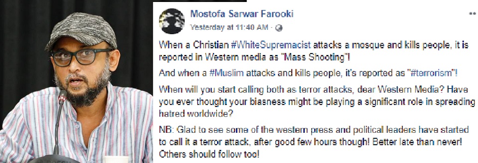 নিউজিল্যান্ডের ক্রাইস্টচার্চে দুটি মসজিদে বন্দুকধারীর নৃশংস হামলায় ঝড়ে গেছে ৪৯টি হাজা প্রাণ।আহত হয়েছেন আরও অন্তত ৪৮জন। নামাজরত অবস্থায় মুসল্লিদের ওপর শেতাঙ্গ বন্দুকধারীর এ হামলা স্মরণকালের ইতিহাসে বর্বরোচিত। এ ঘটনায় নিন্দার ঝড় বইছে সর্বত্র।হামলার নিন্দা জানিয়েছেন নির্মাতা মোস্তফা সরয়ার ফারুকী।তিনি নৃশংস এ হামলাকে পশ্চিমা গণামাধ্যম সন্ত্রাসবাদ হিসেবে উল্লেখ না করতে চাওয়ার নিন্দা জানিয়েছেন।