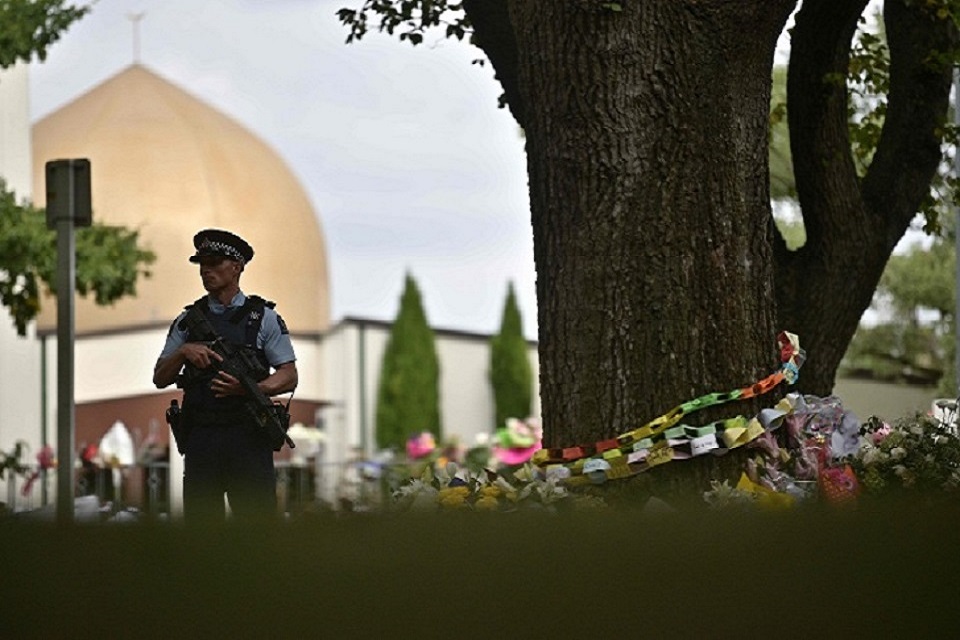 A policeman patrols as delegates and religious leaders wait to enter Al Noor Mosque in Christchurch on March 23, 2019, eight days after a shooting incident claimed the lives of 50 people in two mosques of the city. (Photo by Anthony WALLACE / AFP)