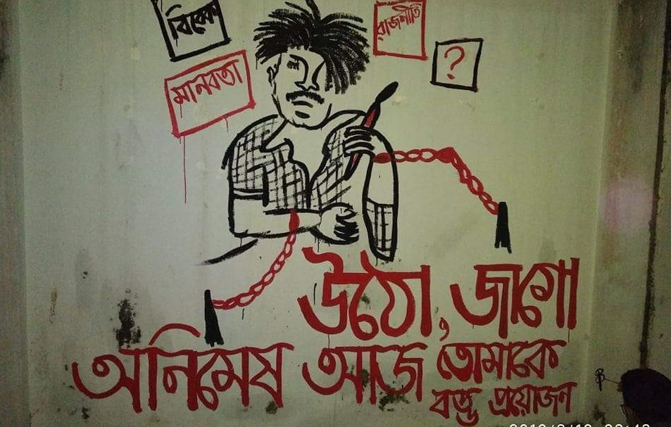 গত বুধবার দুপুরে দেখা গেছে, পৌরসভা আদর্শ উচ্চ বিদ্যালয়ের কাছে জেলা প্রশাসকের বাংলোর দেয়ালে একটি সচিত্র দেয়াল লিখন শোভা পাচ্ছে। চিত্রটিতে ফুটিয়ে তোলা হয়েছে এক যুবকের ছবি। যুবকটির মাথায় উসখু-খুসকু চুল, অনেকটা ঝাউপাতার মতো খাড়া। তার দুই হাত লাল রঙের শেকলে বাঁধা। এক হাতে উচানো রঙের তুলি। মাথার ডান পাশে কালো বাক্সের ভেতর কালো অক্ষরে লেখা বিবেক এবং লাল বাক্সের ভেতর লাল অক্ষরে লেখা মানবতা। অন্যদিকে মাথার বাম পাশে লাল বাক্সে লাল অক্ষরে লেখা রাজনীতি, কালো বাক্সে লাল রঙে একটি প্রশ্নবোধক চিহ্ন। নিচে বড় করে লাল অক্ষরে লেখা ‘উঠো, জাগো/ অনিমেষ আজ তোমাকে বড্ড প্রয়োজন।’ দেয়াল চিত্রটির নিচের বাম কোণে ইংরেজিতে তারিখ লেখা ১৯/০৩/১৯। ইংরেজিতে একটি স্বাক্ষরও আছে।