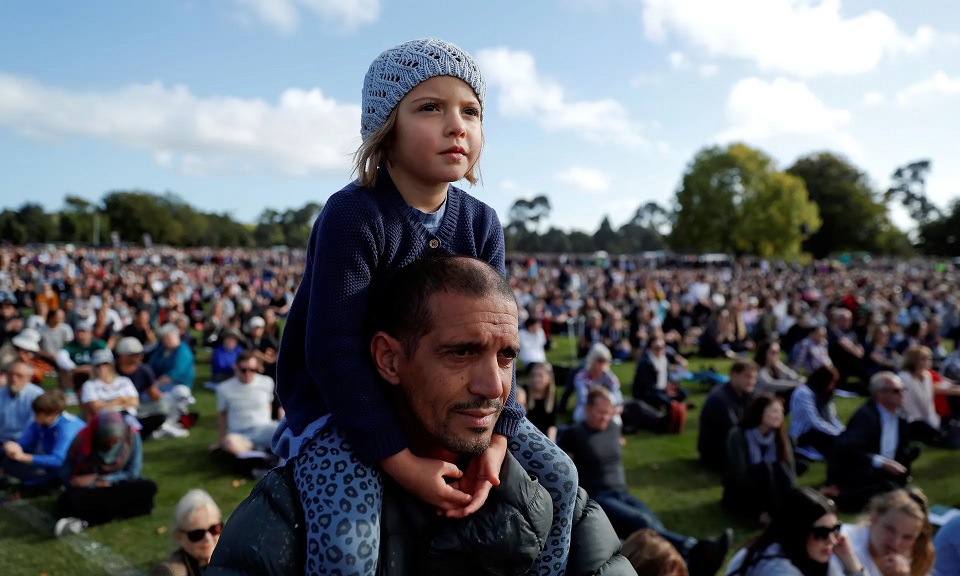 মসজিদে সন্ত্রাসী হামলার ১৪ দিন পর, নিহতদের জাতীয়ভাবে স্মরণ করল নিউজিল্যান্ড। ক্রাইস্টচার্চের হ্যাগলে পার্কে শুক্রবার জড়ো হন ২০ হাজারের বেশি মানুষ। এ সময় মুসলিম সম্প্রদায়ের পাশে দাঁড়ান খোদ প্রধানমন্ত্রীসহ গোটা মন্ত্রিপরিষদ।