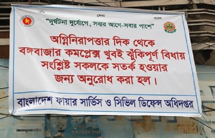 ব্যানারে লেখা হয়েছে, “অগ্নিনিরাপত্তার দিক থেকে বঙ্গবাজার কমপ্লেক্স খুবই ঝুঁকিপূর্ণ বিধায় সংশ্লিষ্ট সকলকে সতর্ক হওয়ার জন্য অনুরোধ করা হল।”