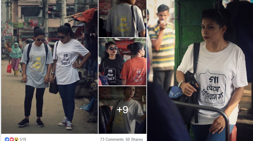 গত ৪ এপ্রিল রাত ১২টা ৪৮ মিনিটে “BJNS’ – বিজেন্স” এর ফেসবুক পেইজে ‘গা ঘেঁষে দাঁড়াবেন না’ স্লোগান লেখা টি-শার্ট গায়ে নারীদের জনপরিসরে বিচরণের ১২টি ছবি (মডেলিং) আপলোড করা হয়।