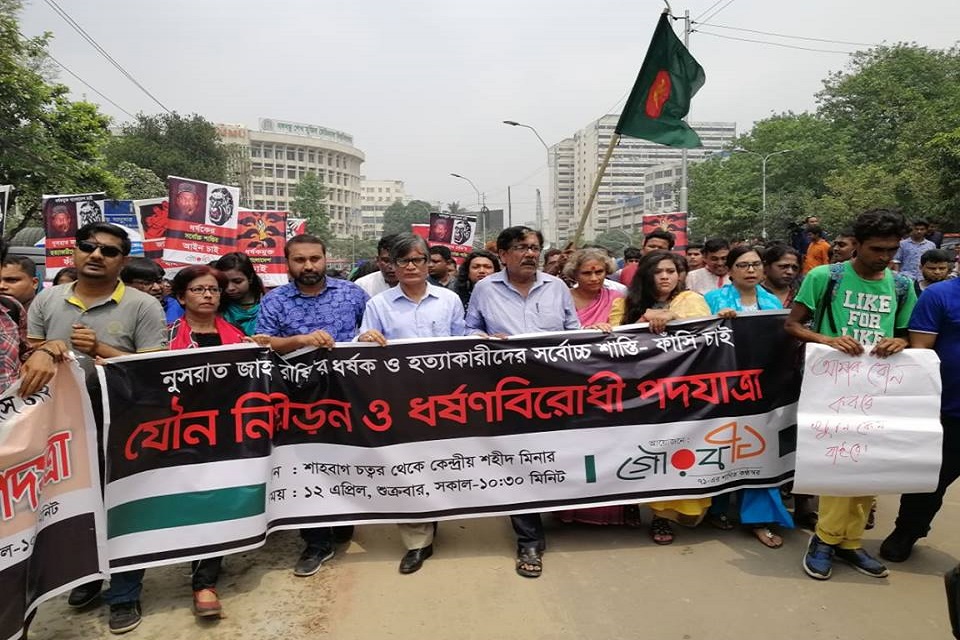 মাদ্রাসা অধ্যক্ষ কর্তৃক যৌন নিপীড়নের শিকার হয়ে প্রতিবাদ করতে যেয়ে সন্ত্রাসীদের দ্বারা আগুনে পুড়ে নিহত ফেনী সোনাগাজী ফাজিল মাদ্রাসার ছাত্রী নুসরাত জাহার রাফির হত্যাকারীদের সর্বোচ্চ শাস্তি ফাঁসি চেয়ে যৌন নিপীড়ন ও ধর্ষণ বিরোধী পদযাত্রা করেছে গৌরব ৭১ ও পূর্ণিমা ফাউন্ডেশন নামে দুটি সংগঠন।
