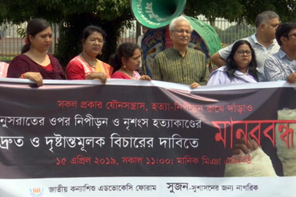 নুসরাত রাফি হত্যাকান্ডের সাথে জড়িতদের দ্রুত দৃষ্টান্তমূলক শাস্তির দাবিতে মানববন্ধন করেছে সুশাসনের জন্য নাগরিক ও জাতীয় কন্যা শিশু অ্যাডভোকেসি ফোরাম।