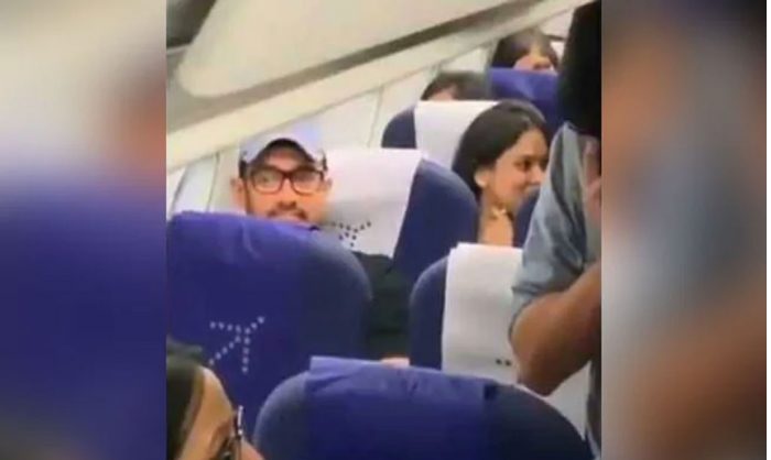 ভিডিওতে দেখা যাচ্ছে, বিমানের একটি জানলার ধারের আসনে বসেছেন আমির। পরনে কালো টি-শার্ট আর নীল টুপি। চোখে চশমা। ঘুরে ঘুরে তাঁর চারপাশের উপস্থিত সহ-যাত্রীদের দেখছেন।