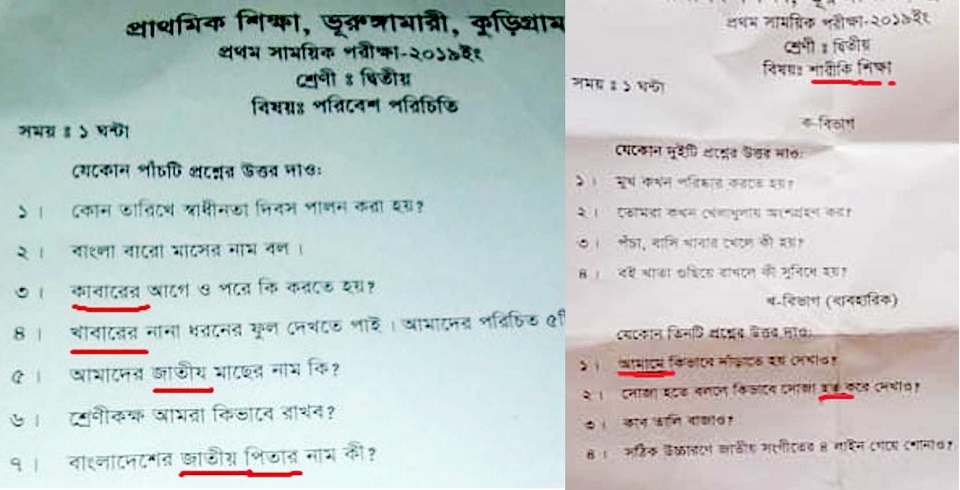 জানা যায়, বুধবারের গৃহিত ২য় শ্রেণির পরিবেশ পরিচিতি প্রশ্নপত্রে দেখাযায় অসংখ্য বানান ভুল। এ পরীক্ষায় সাতটি প্রশ্ন থেকে পাঁচটি প্রশ্নের উত্তর চাওয়া হয়। ওই প্রশ্নপত্রের ৩নং প্রশ্নে বলা হয় কাবারের আগে ও পরে কি করতে হয়? প্রশ্নটি হওয়ার কথা খাবারের আগে ও পরে কি করতে হয়। ৪নং প্রশ্নে বলা হয় খাবারের নানা ধরণের ফুল দেখতে পাই। আমাদের পরিচিত পাঁচটি ফুলের নাম বল। প্রশ্নটি হওয়ার কথা বাগানে নানা ধরণের ফুল দেখতে পাই। আমাদের পরিচিত পাঁচটি ফুলের নাম বল। ৫নং প্রশ্নে বলা হয়েছে আমাদের জাতীয মাছের নাম কি? জাতীয এর জায়গায় হবে জাতীয় মাছের নাম কী। ৭নং প্রশ্নে বলা হয়েছে বাংলাদেশের জাতীয় পিতার নাম কী? জাতীয় পিতার স্থানে হওয়ার কথা জাতির পিতার নাম কী? এছাড়া একই প্রশ্নপত্রে কী দিয়ে প্রশ্ন করতে কখনও ই-কার কখনও ঈ-কার ব্যবহার করা হয়েছে।