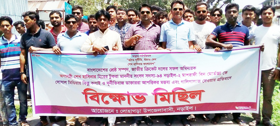 নড়াইল-২ আসনের সংসদ সদস্য ও বাংলাদেশ ক্রিকেট দলের ওয়ানডে অধিনায়ক মাশরাফী বিন মোর্ত্তজাকে নিয়ে ফেসবুকে বিভিন্ন নেতিবাচক ও আপত্তিকর মন্তব্যের প্রতিবাদে লোহাগড়ায় বিক্ষোভ মিছিল হয়েছে। লোহাগড়া উপজেলাবাসীর ব্যানারে মঙ্গলবার দুপুরে এ মিছিল অনুষ্ঠিত হয়।