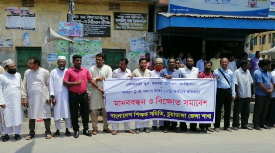 চাকরি জাতীয়করণসহ ৫ দফা দাবিতে চুয়াডাঙ্গায় বেসরকারি স্কুল কলেজ ও মাদ্রাসার শিক্ষক কর্মচারীরা মানববন্ধন করেছে। রোববার বেলা ১১টায় শহরের কেদারগঞ্জ আর্দশ স্কুলের সামনে এ মানববন্ধন অনুষ্ঠিত হয়।