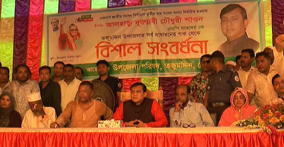 তৃতীয় বারের মতো ভোলা-৩ আসন থেকে সংসদ সদস্য নির্বাচিত হওয়ায় নূরন্নবী চৌধুরী শাওনকে সংবর্ধনা দিয়েছে ভোলার তজুমদ্দিন উপজেলা পরিষদ। আজ দুপুরে উপজেলা পরিষদ চত্বরে এ উপলক্ষ্যে অনুষ্ঠানের আয়োজন করা হয়। উপজেলা চেয়ারম্যান মোঃ মোশারেফ হোসেন দুলালের সভাপতিত্বে প্রধান অতিথি হিসেবে বক্তব্য রাখেন সংসদ সদস্য নুরুন্নবী চৌধুরী শাওন।