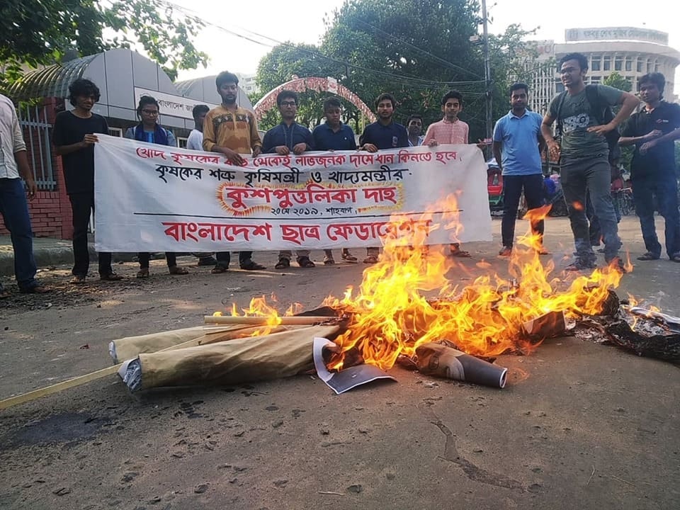 ধানের ন্যায্য দাম থেকে কৃষককে বঞ্চিত করা এবং এ বিষয়ে দুই মন্ত্রীর বক্তব্যের প্রতিবাদে কৃষিমন্ত্রী ড. আব্দুর রাজ্জাক ও খাদ্যমন্ত্রী সাধন চন্দ্র মজুমদারের কুশপুত্তলিকা দাহ করেছে বাংলাদেশ ছাত্র ফেডারেশন। সোমবার বিকেলে রাজধানীর শাহবাগে জাতীয় জাদুঘরের সামনে তারা এই কুশপুত্তলিকা দাহ করে।