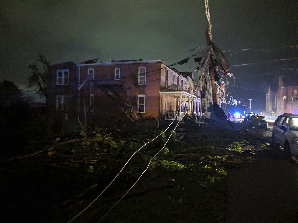 This image posted on Twitter account of Stechshultsy shows tornado-hit Jefferson City. MO., Thursday, May 23, 2019. The National Weather Service has confirmed a large and destructive tornado has touched down in Missouri's state capital, causing heavy damage and trapping multiple people in the wreckage of their homes.(Stechshultsy via AP)