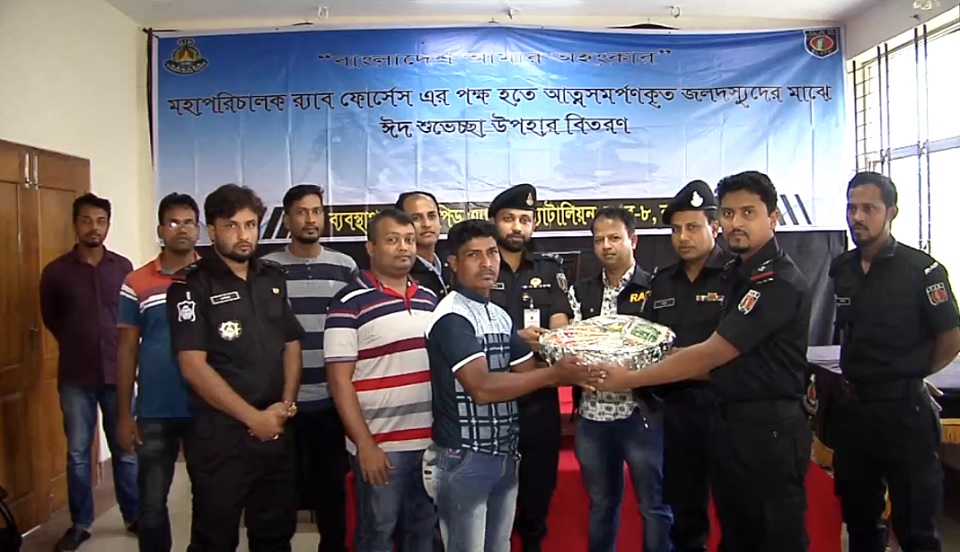 উপহার বিতরণ উপলক্ষে দুপুরে র্যাব-৮ এর সদর দফতরে এক অনুষ্ঠানের আয়োজন করা হয়। র্যাব মহাপরিচালক বেনজীর আহমেদের পক্ষে থেকে আত্মসমর্পণকারী দুইশ’ ৮৪ জন জলদস্যুদের হাতে উপহার তুলে দেন উপ অধিনায়ক মেজর সজিব।