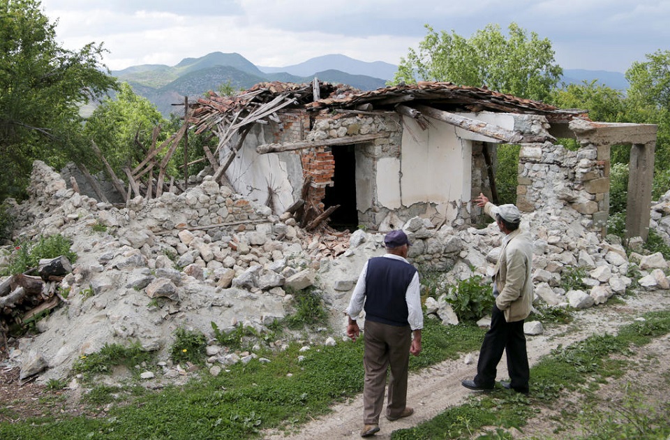 Residents inspect a destroyed building after an earthquake stroked the area in Floq, Albania, June 1, 2019. REUTERS/Florion Goga