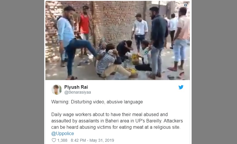 মাংস খাওয়ার অভিযোগে চার শ্রমিককে বেধড়ক মারধর করেছে ভারতের উত্তর প্রদেশের উগ্রপন্থী হিন্দুত্ববাদী জঙ্গিরা। মারধরের শিকার চার শ্রমিকের মধ্যে ২ জন মুসলমান ছিলেন। উত্তর প্রদেশের বরেলিতে এ ঘটনা ঘটেছে।