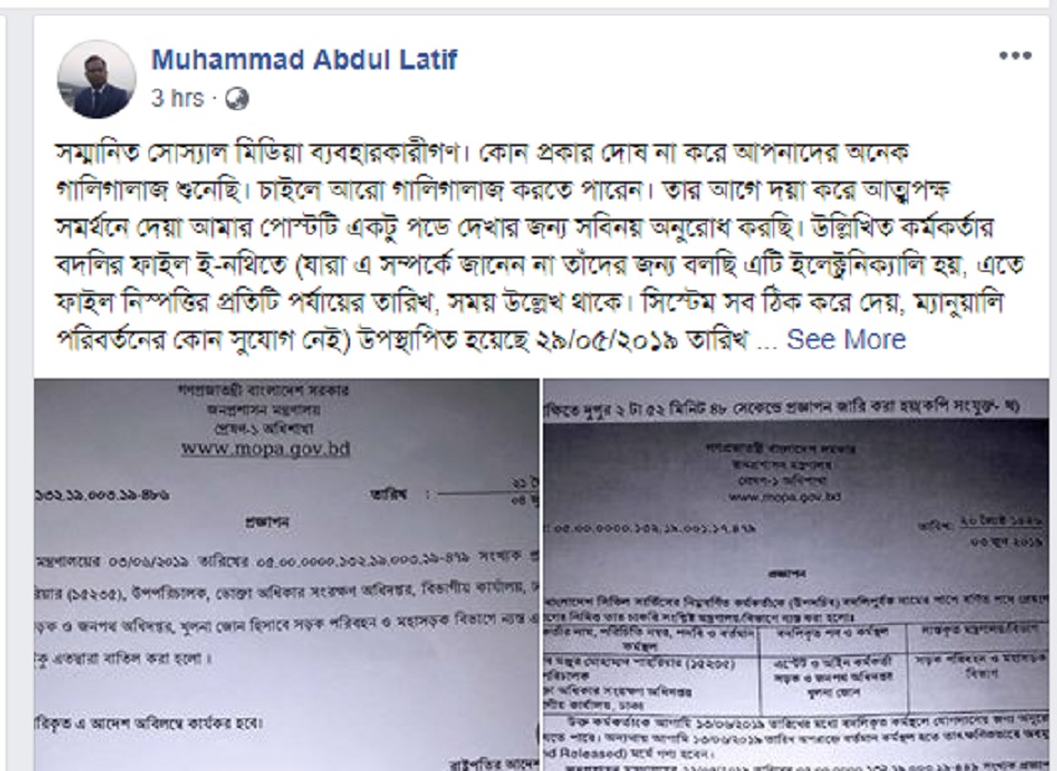 সম্মানিত সোস্যাল মিডিয়া ব্যবহারকারীগণ। কোন প্রকার দোষ না করে আপনাদের অনেক গালিগালাজ শুনেছি। চাইলে আরো গালিগালাজ করতে পারেন। তার আগে দয়া করে আত্ম্বপক্ষ সমর্থনে দেয়া আমার পোস্টটি একটু পডে দেখার জন্য সবিনয় অনুরোধ করছি। উল্লিখিত কর্মকর্তার বদলির ফাইল ই-নথিতে (যারা এ সম্পর্কে জানেন না তাঁদের জন্য বলছি এটি ইলেক্ট্রনিক্যালি হয়, এতে ফাইল নিস্পত্তির প্রতিটি পর্যায়ের তারিখ, সময় উল্লেখ থাকে। সিস্টেম সব ঠিক করে দেয়, ম্যানুয়ালি পরিবর্তনের কোন সুযোগ নেই) উপস্থাপিত হয়েছে ২৯/০৫/২০১৯ তারিখ বিকাল ৩ টা ৩৬ মিনিট ০৪ সেকেন্ডে যা ৫ জন কর্মকর্তার ডেস্ক হয়ে সচিব মহোদয় কর্তৃক চুড়ান্ত অনুমোদন হয়েছে ০৩/০৬/২০১৯ তারিখ সকাল ১০টা ২০ মিনিট ২৯ সেকেন্ডে। অনুমোদনের পর বদলির আদেশ জারি করা হয়েছে। আড়ং এ মোবাইল কোর্ট পরিচালনার ঘটনাটি ঘটেছে দুপুর ১ টা থেকে যা মিডিয়ার মাধ্যমে আমরা জানতে পারি সন্ধ্যায়(অফিসিয়াল কাজ সম্পর্কে যারা জানেন তারা নিশ্চয় অবগত আছেন ফাইল অনুমোদনের পর সেকশন অফিসারকেই আদেশটি জারি করতে হয়, আমিও সেটিই করেছি)। ফাইলের অনুমোদন ও আদেশ জারি দুটিই আড়ং এর ঘটনা ঘটার/জানার আগেই। উক্ত আদেশের ক্ষেত্রে আমার বা জনপ্রশাসনের কোন স্বার্থ ছিলো না। তারপরও সোস্যাল মিডিয়া ব্যবহারকারীদের প্রতি শ্রদ্ধা ও সম্মান জানিয়ে এই আদেশটি জনপ্রশাসন মন্ত্রণালয় কর্তৃক বাতিল করা হয়েছে। বদলির আদেশ ও বাতিল সংক্রান্ত প্রমানাদি আপলোড করা হলো ।