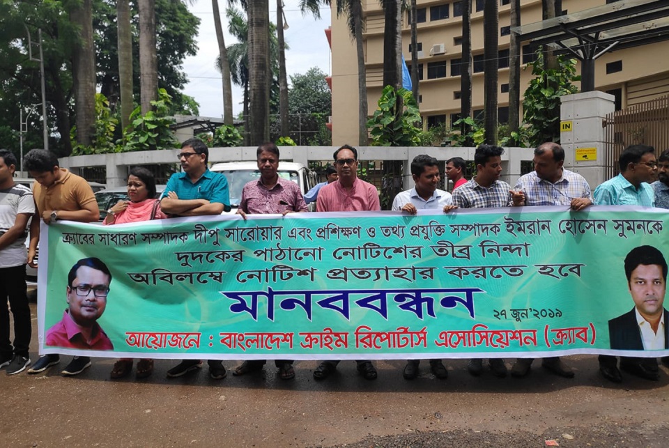 সকালে ক্রাইম রিপোর্টার্স এসোসিয়েশন- ক্র্যাবে’র মানববন্ধনে দুদকের জনসংযোগ কর্মকর্তা প্রণব কুমার ভাট্টাচার্য বলেন, দুই সাংবাদিককে দেয়া চিঠির কার্যকারিতা ২৬ জুন শেষ হয়ে গেছে। চিঠি নিয়ে উদ্বিগ্ন হওয়ার কিছু নেই বলেও মন্তব্য করেন তিনি।