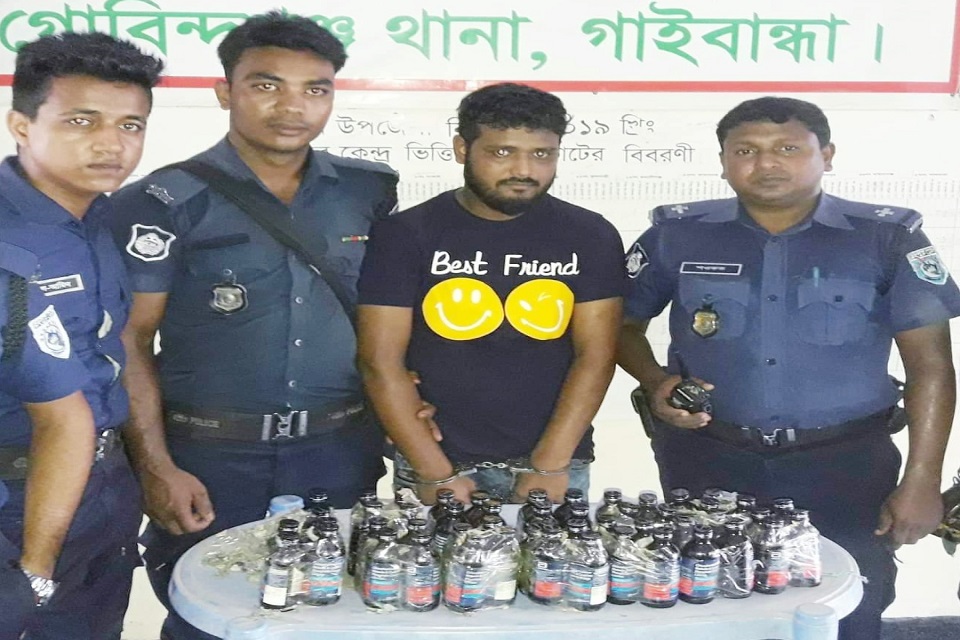 গোবিন্দগঞ্জ থানার ভারপ্রাপ্ত কর্মকর্তা (ওসি) একেএম মেহেদী হাসান জানান, দিনাজপুর থেকে ঢাকাগামী নাবিল পরিবহণের বাসে ফেন্সিডিল বহণ করা হচ্ছে এমন গোপন সংবাদের ভিত্তিতে গোবিন্দগঞ্জের বাগদা এলাকার অঞ্চলিক সড়ক এলাকায় অভিযান চালায় পুলিশ। এ সময় বাসটিতে তল্লাশী চালিয়ে মোতাব্বের হোসেন মুগ্ধকে আটক করা হয়। এসময় তার শরীরে রাখা ৫০ বোতল ফেন্সিডিল উদ্ধার করা হয়। মুগ্ধের শরীরে বিশেষ কায়দায় বেঁধে রাখা হয়েছিল ফেন্সিডিলগুলো। উদ্ধার করা ফেন্সিডিলগুলোর মুল্য ২৫ হাজার টাকা।