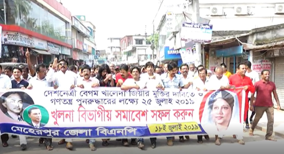 বেগম খালেদা জিয়ার মুক্তি ও খুলনা বিভাগীয় সমাবেশ সফল করার লক্ষ্যে বিক্ষোভ মিছিল করেছে মেহেরপুর জেলা বিএনপি। আজ সকাল সাড়ে ৯ টার দিকে শহরের বোস পাড়াস্থ জেলা বিএনপির কার্যালয় থেকে একটি মিছিল বের করা হয়। মিছিলটি শহরের প্রধান সড়ক প্রদক্ষিণ শেষে একই স্থানে এসে শেষ হয়। মিছিল থেকে খালেদা জিয়ার মুক্তির দাবিতে বিভিন্ন শ্লোগান দেওয়া হয়। পাশাপাশি আগামী ২৫ জুলাই গণতন্ত্র পুনরুদ্ধারের দাবিতে বিএনপির খুলনা বিভাগীয় সমাবেশ সফল করার আহ্বান জানানো হয়।