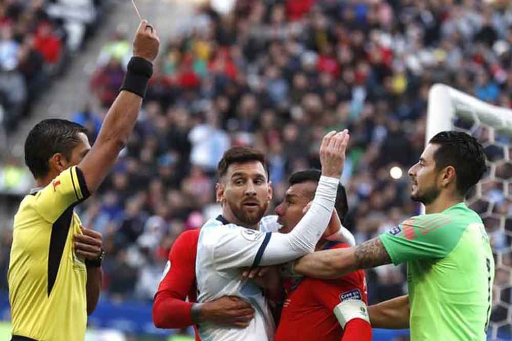 ব্রাজিলে অনুষ্ঠিত কোপা আমেরিকার তৃতীয় স্থান নির্ধারণী ম্যাচে চিলির গ্যারি মেডেলের সঙ্গে ধাক্কাধাক্কির জেরে লাল কার্ড পান আর্জেন্টিনার অধিনায়ক লিওনেল মেসি। এ ঘটনার পর আয়োজক ব্রাজিল এবং ম্যাচ রেফারিদের ‘দুর্নীতিপরায়ণ’ হিসেবে অভিযুক্ত করেন আর্জেন্টাইন অধিনায়ক। সেই সাথে ল্যাটিন আমেরিকার ফুটবল কর্তৃপক্ষের সমালোচনা করেন তিনি।