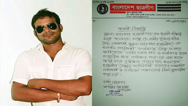 বিজ্ঞপ্তিতে বলা হয়, খুলনা মহানগর ছাত্রলীগের এক জরুরি সিদ্ধান্ত মোতাবেক জানানো যাচ্ছে যে, সমীর কুমার শীল সহসভাপতি, খুলনা মহানগর ছাত্রলীগ সংগঠন পরিপন্থী কাজে লিপ্ত থাকার অভিযোগে দলীয় সব কর্মকাণ্ড থেকে তাকে সাময়িক বহিষ্কার করা হলো এবং তাকে স্থায়ীভাবে বহিষ্কার করার জন্য কেন্দ্রীয় ছাত্রলীগের সভাপতি ও সাধারণ সম্পাদকের কাছে সুপারিশ করা হলো।