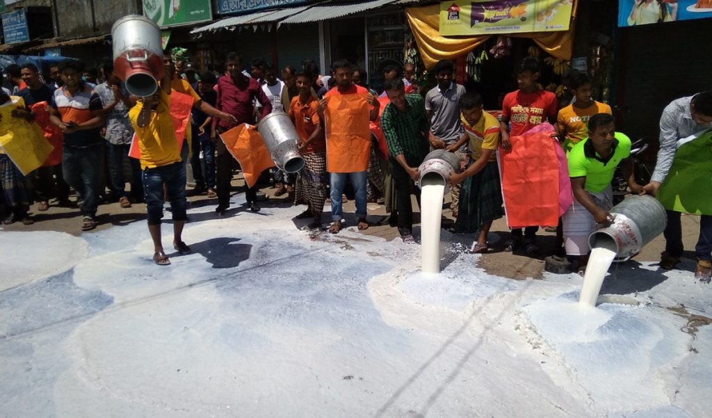 বিভিন্ন কোম্পানি দুধ সংগ্রহ বন্ধ করে রাখার প্রতিবাদে পাবনার ভাঙ্গুড়া উপজেলার খামারিরা সড়কে দুধ ঢেলে প্রতিবাদ করেছেন। সোমবার দুপুরে ভাঙ্গুড়া শহরের প্রবেশ মুখে অর্ধ শতাধিক খামারি দুধ ঢেলে এই প্রতিবাদ জানান। এর আগে তারা সেখানে ৩০ মিনিট ব্যাপী মানববন্ধন ও বিক্ষোভ কর্মসূচি পালন করে। এসময় শহরে প্রবেশকারী যানবাহন চলাচল বাধাগ্রস্থ হয়। মানববন্ধনে উপজেলার বিভিন্ন গ্রামের দুগ্ধ সমবায় সমিতির ব্যবস্থাপক ও খামারিরা বক্তব্য রাখেন।