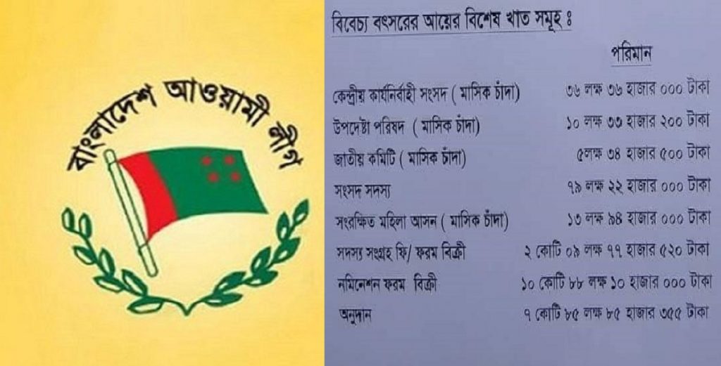 প্রতিবেদন থেকে জানা যায়, আয়ের ১০ কোটি ৫৬ লক্ষ ৫৩ হাজার টাকা দিয়ে দলের কেন্দ্রীয় কার্যালয় স্থাপন করা হয়েছে। নির্বাচনের সময় নমিনেশন ফরম বিক্রি করে আয় হয় ১০ কোটি ৮৮ লাখ ৮৫ হাজার ৩৫৫ টাকা। এছাড়া অনুদান থেকে আয় করা হয় ৭ কোটি ৮৫ লাখ ৮৫ হাজার ৩৫৫ টাকা। সংসদ সদস্যরা দেয় ৭৯ লাখ ২২ হাজার টাকা।