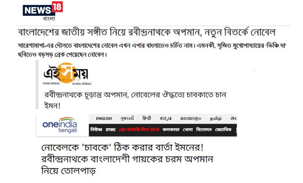 আরেকটি পোর্টালের শিরোনাম, “নোবল করলেন রবীন্দ্রনাথ ঠাকুরের সৃষ্টিকে অপমান, ইমন চক্রবর্তী ক্ষুব্ধ!” অন্য একটিতে লেখা হয়েছে, “বিশ্বকবি রবীন্দ্রনাথ ঠাকুরকে নাকচ করে দিলেন নোবেল! উঠতি গায়কের ঔদ্ধত্যে তাঁকে চাবকাবেন প্রসিদ্ধ গায়িকা ইমন”