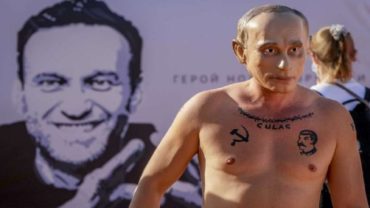 পুতিনের মুখোশ পরে বিক্ষোভ