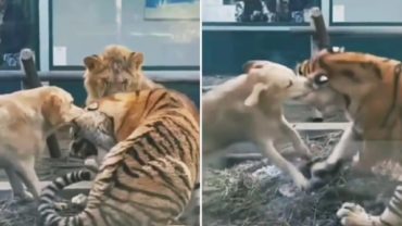 বাঘের কান কামড়ে ধরল কুকুর, নীরবে দেখছে সিংহ। (ভিডিও)