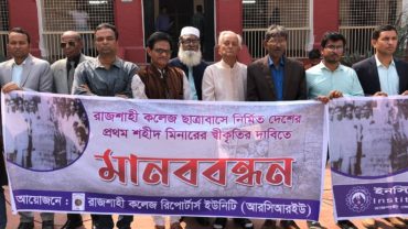 রাজশাহী কলেজে দেশের প্রথম শহীদ মিনারের রাষ্ট্রীয় স্বীকৃতির দাবিতে মানববন্ধন